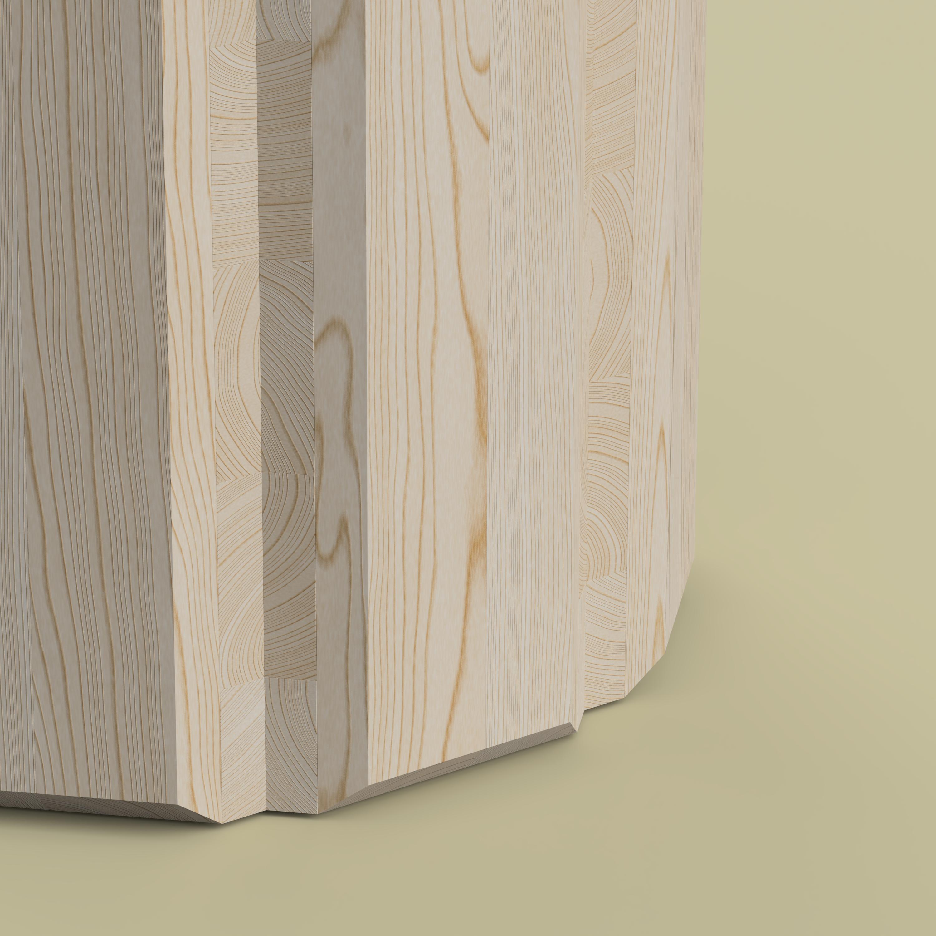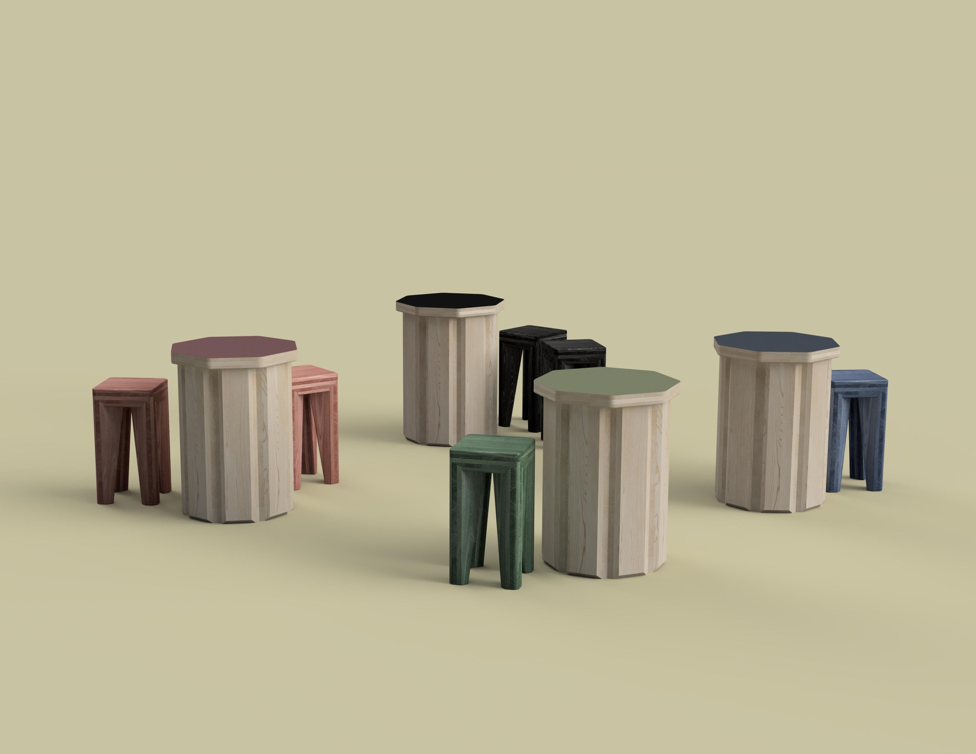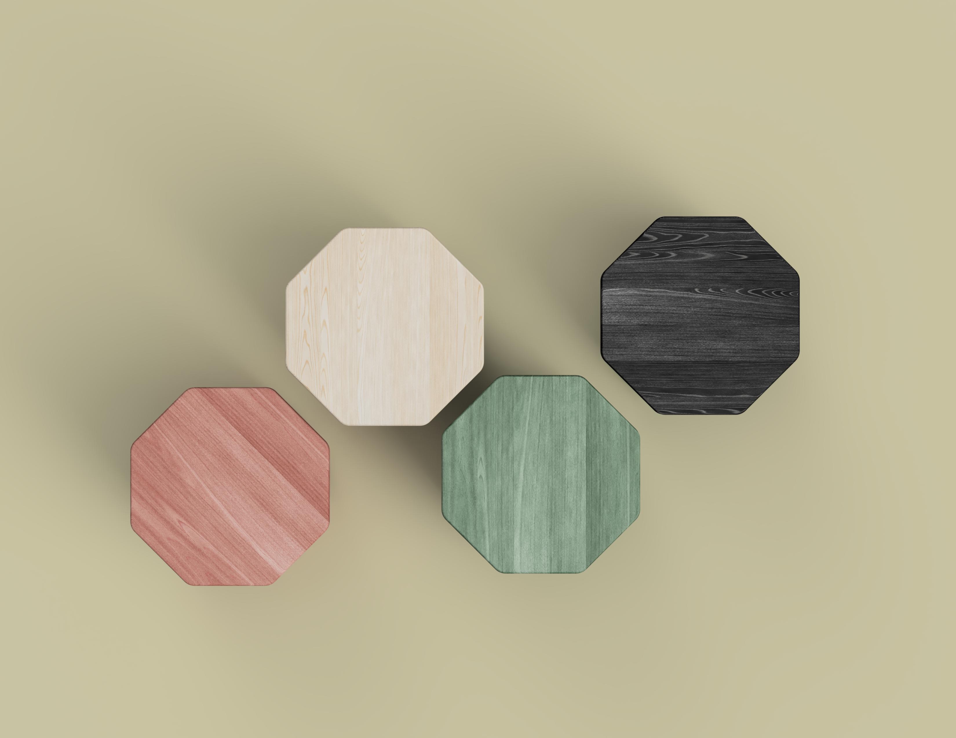 Oktagon är en möbelserie bestående av pelarbord och pall samt underrede till konferensbord. Möbeln kan tillverkas i allt från 60 till 140 mm KL-trä.